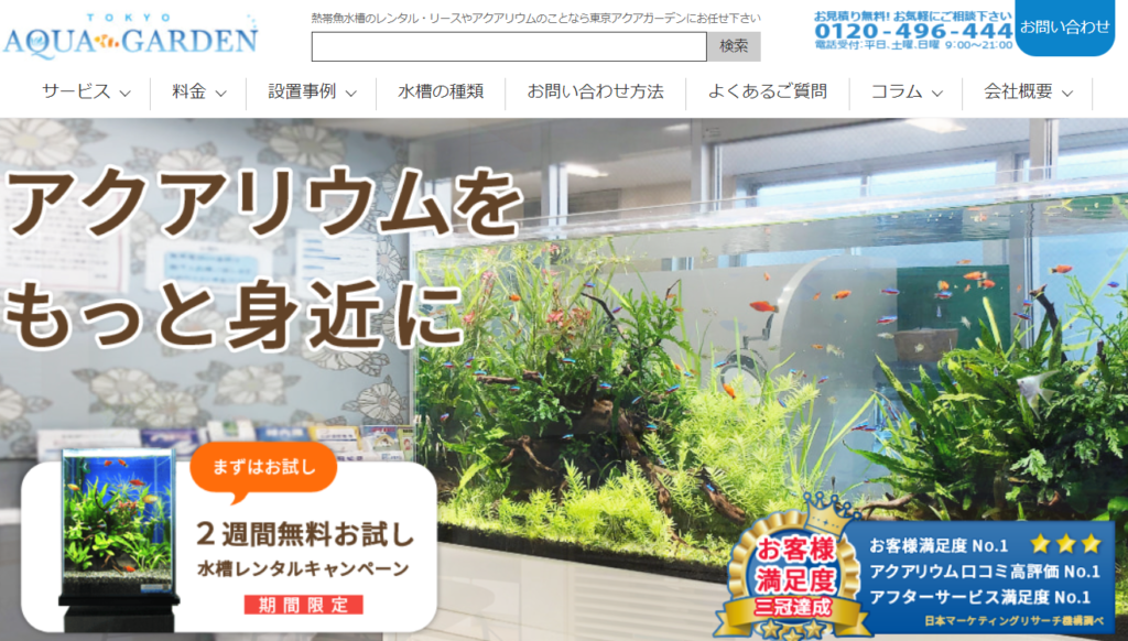 東京都を中心に熱帯魚水槽、アクアリウムのレンタルサービスを提供している会社です。初期費用無料ということで、アクアリウムを設置した事のない方でもハードル低くトライすることができます。また、アクアリウム歴15年のスペシャリストが創業、デザインをしているので会社毎やイメージにあったアクアリウムの提案が可能です。メンテナンスは月に2回と手厚いアフターサービスを受けることができる事も特徴です。